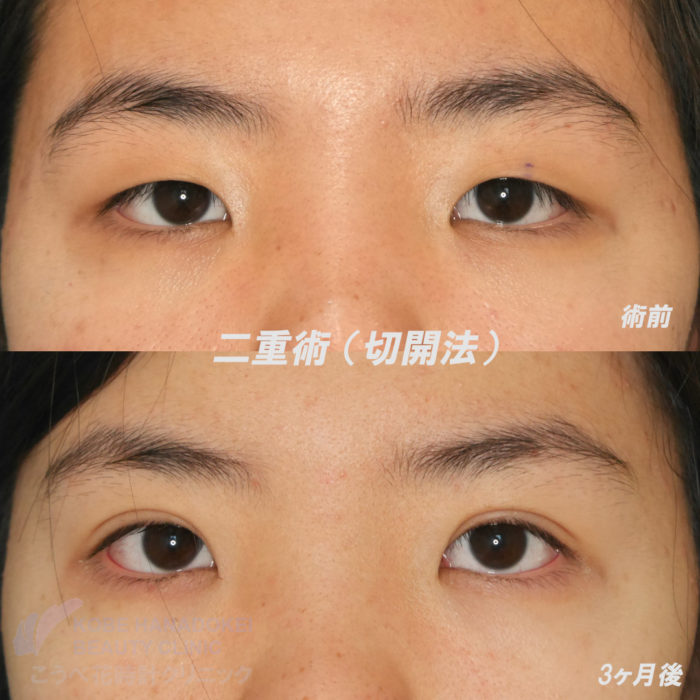術後の腫れはやや長引きようやく術後2ヶ月で落ち着きかけ、3ヶ月でほぼ希望通りの二重が完成し傷跡も目立っていないのが分かると思います。