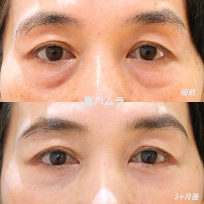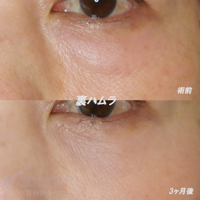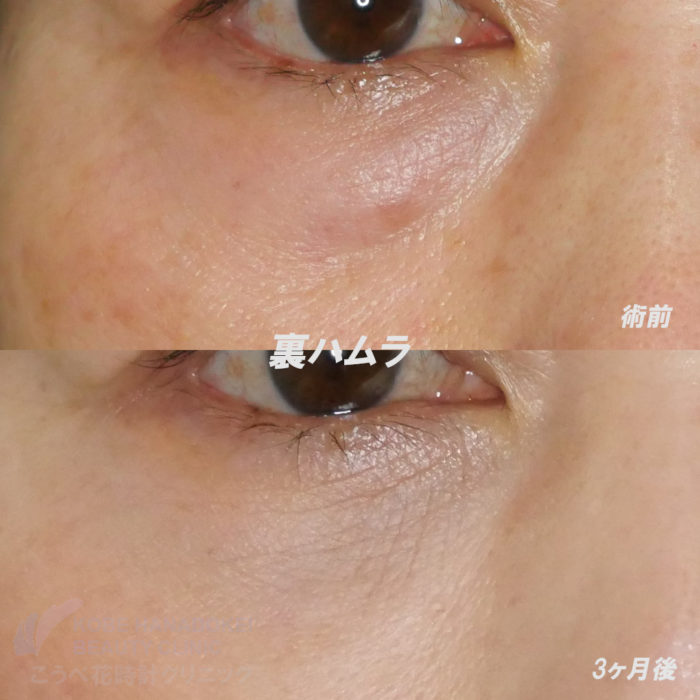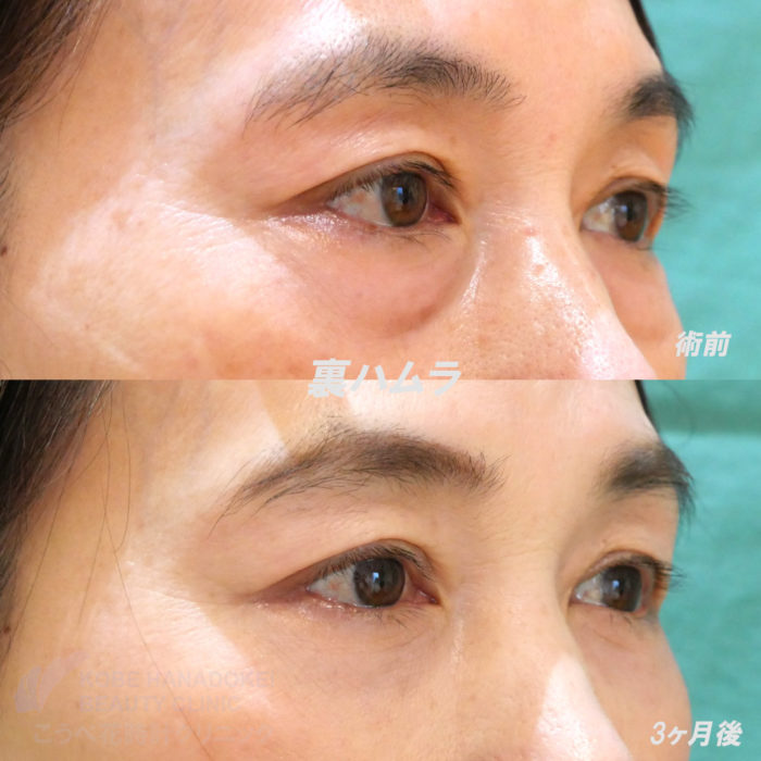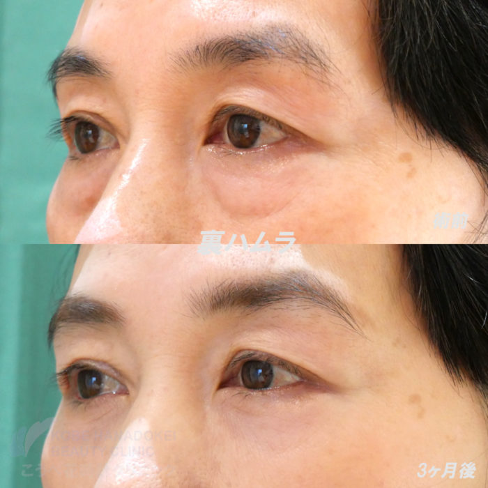 術後は皮下出血や腫れも比較的軽度で3ヶ月後の状態では見方によっては小じわがほんの少し増えたように見えなくもありませんが、ほとんどの患者さんは小じわが少し増えたことよりも目袋の膨らみやクマがすっきりしたことに満足されておられるように感じます。