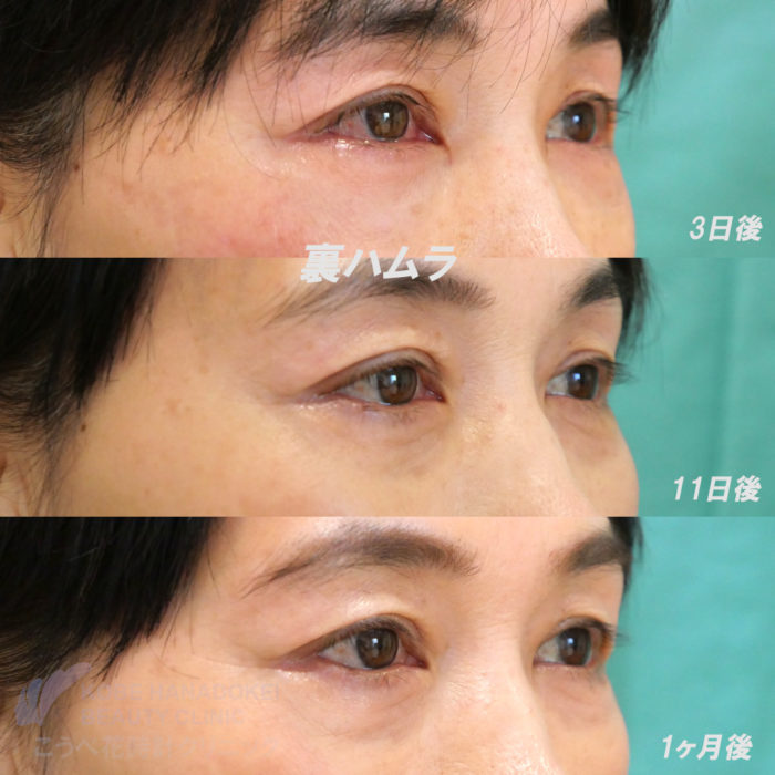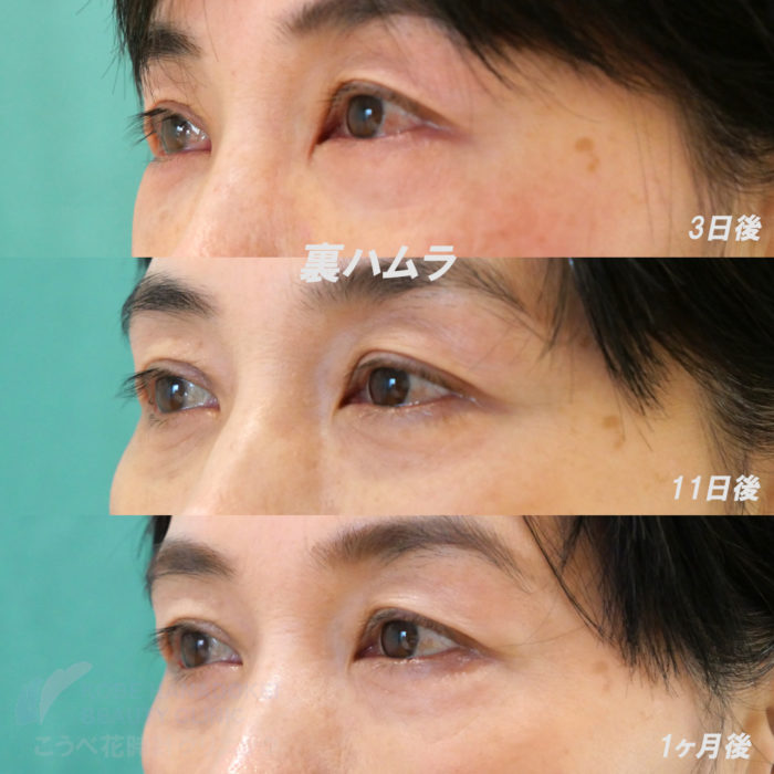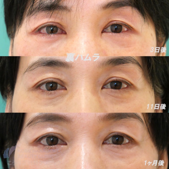 ハムラ法というのはこの突出した眼窩脂肪を窪みの位置に移動(再配置)する概念で、この操作を瞼の裏側から行う術式が裏ハムラ法になります。