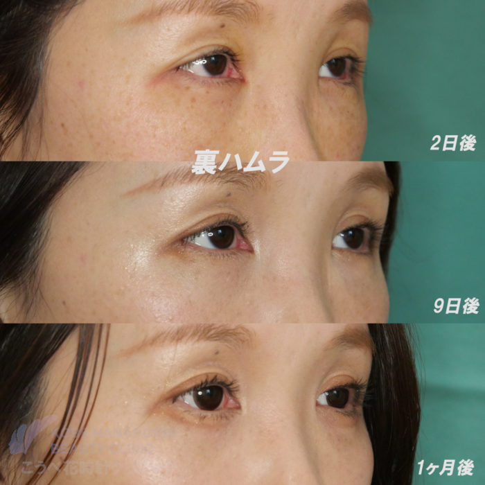 当院では血腫(術後に再出血しその血液が創部の中に溜まって固まってしまう合併症)が起こってしまうのをなるべく予防する目的で2~3日ほど下瞼にテープによる圧迫固定を行っているのですが、この患者さんの場合、術後2日目にテープをはがした際は皮下出血はほとんどなく、むくみ程度の腫れがわずかに認められる程度でした。