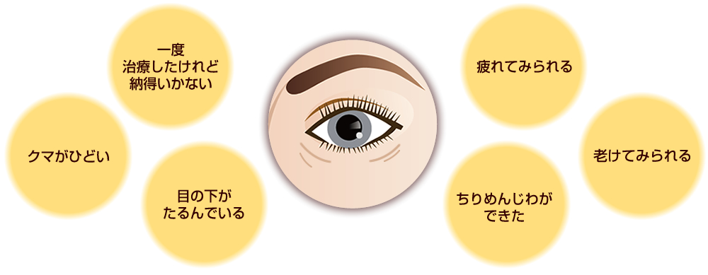 目の下のクマやたるみがあると、年齢以上に老けて見えたり、疲れて見えてしまう事から、年齢性別を問わず日常的なお悩みとして、当院にも多くの方が相談にこられます。